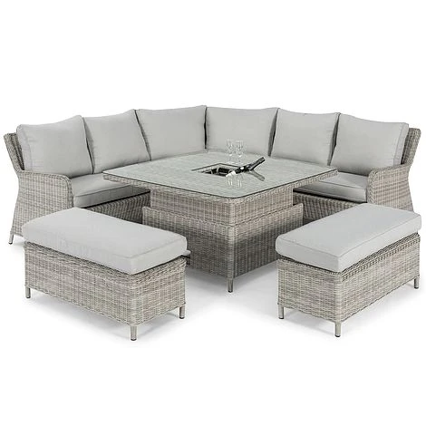The Oxford Royal Corner Set is a wonderful garden furniture set, perfect for socialising and dining with friends and family in the summer months. The Maze Rattan Dining Set comes in this functional design with a rising table to allow you to go from lounging to dining easily and with an added bonus of an integrated ice bucket perfect for keeping your drinks chilled. The Oxford Corner Set is made with a modern grey coloured half round rattan weave with a powder coated aluminium framing to ensure use all year round. The Maze Rattan Royal Set includes a spacious corner set and two expansive bench seats with deep-filled seat and back cushions to provide comfort and support. Whilst the cushions are showerproof we would always recommend taking them in doors when not in use, even if the furniture is covered.