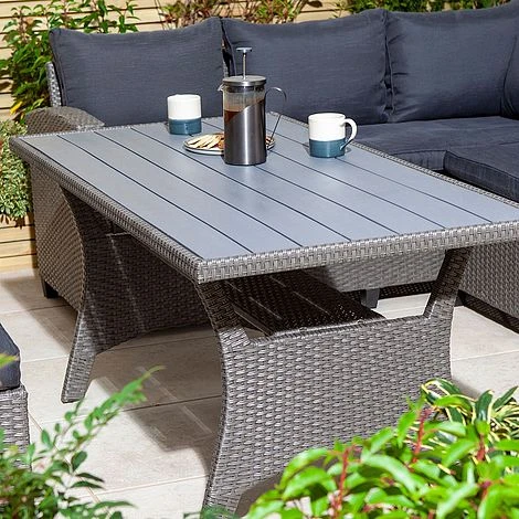 Share moments of fun in the garden with your friends and family. This set is a great solution for the customer who doesn’t want to compromise on quality and design. The modern-looking Albany set comprises of a comfortable corner sofa, a dining table and two ottoman stools. Both sofa and stools come with cushions in a flattering beige colour, which perfectly complements the natural tone of the rattan and will be at home in any type of garden or patio. The large, robust table allows for many dishes to be served on and you can enjoy drinks, finger food or even Sunday roast amid your garden. The table comes with an integrated shelf for storing various items out of the way when food is served. The stools come with convenient holes which will help carrying them around. The Albany is the perfect dining set for casual family time and the sharing of food and memories. Rattan Garden Furniture set