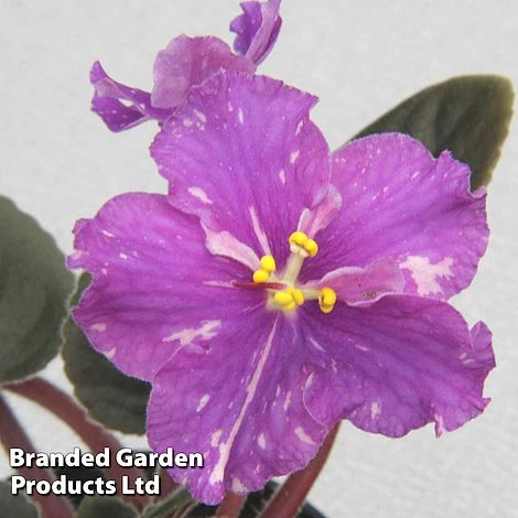 Saintpaulia ‘An-Rio Rita’ bears bright purple petals scattered with pale streaks and splashes.